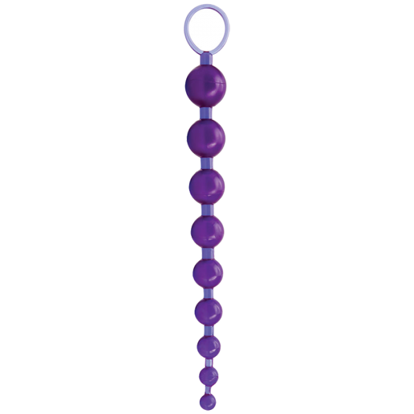 Анальные бусы фиолетового цвета на жесткой сцепке из достаточно упругого материала. Бусы состоят из девяти шариков, постепенно увеличивающихся в диаметре. Оснащены колечком для удобного извлечения.