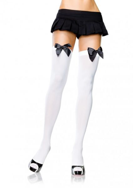 Плотные капроновые чулочки белого цвета с черным атласным бантиком. На ножке держатся благодаря плотной резинке.