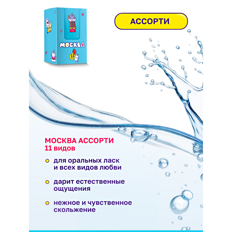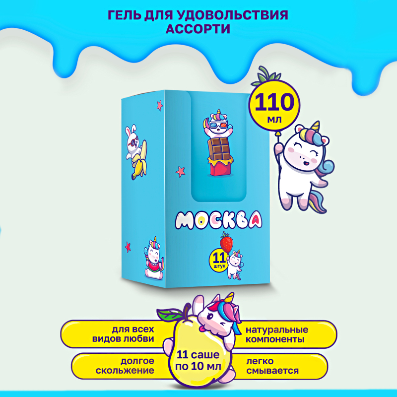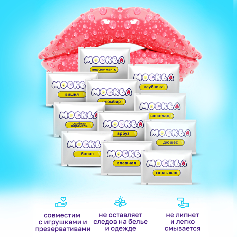 Ассорти смазки «Москва влажная» — это универсальный набор смазок, созданных специально для интимных отношений. В наборе представлено 11 саше по 10 мл каждое. Он включает в себя оральные смазки с разными вкусами, а также 2 саше смазки для вагинального и анального секса: «Влажная» на водной основе и «Скользкая» на водно-силиконовой основе.