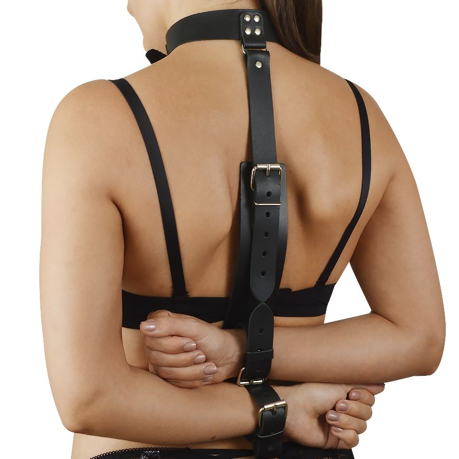 Наручники вместе с ошейником установлены на основе, которая не снимается, что предотвращает скольжение по телу и смещение. Более этого, комплект регулируется пряжками для комфортной посадки.