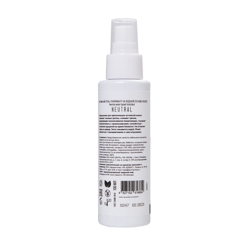 Лубрикант Eromantica Neutral на водной основе — это продукт, который предлагает отличное скольжение и комфорт при интимной близости. Вот несколько его характеристик: