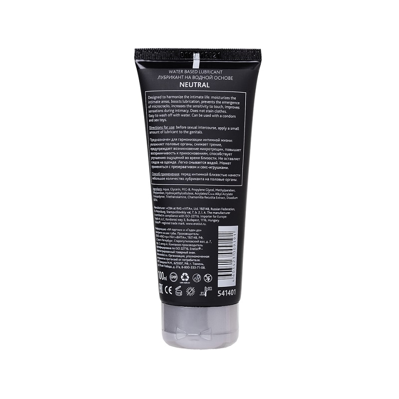 Erotist Neutral — это лубрикант на водной основе, который не имеет запаха. Он дарит отличное скольжение и предотвращает трение. Огромным преимуществом этого лубриканта является то, что он сочетается с презервативами и всеми видами секс-игрушек, не оставляет пятен и прекрасно смывается водой. При отсутствии «трения» в течение нескольких минут он высыхает, увлажняя кожу, но при этом не остается липкого эффекта.
