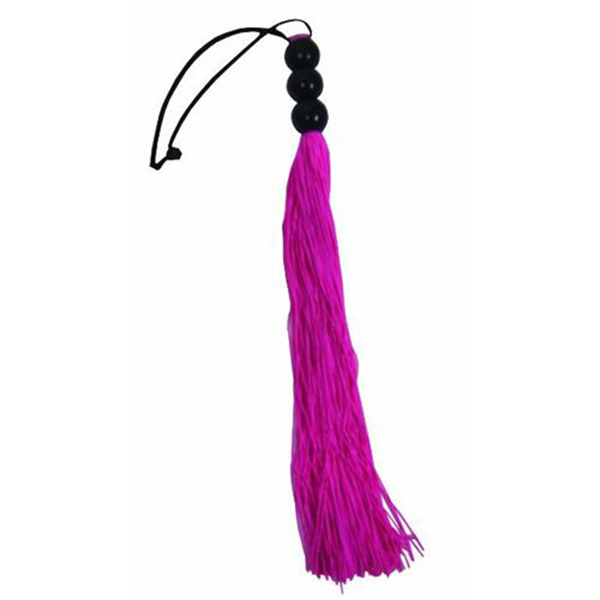 Маленькая плеточка с густыми ярко-розовыми хвостами из латекса. Коротенькая рукоятка из трех деревянных черных шариков. Для удобства плетка оснащена петлей для руки. Идеальный атрибут для спальных забав.