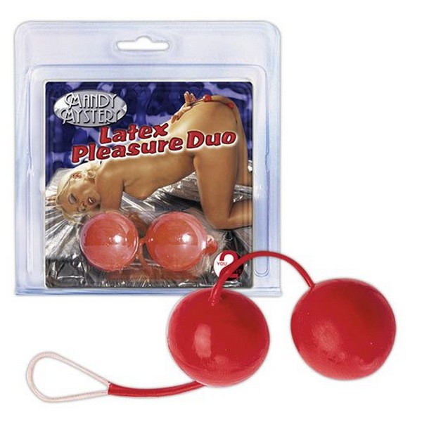 Два великолепных шарика из пластика в латексной оболочке. Вагинальные шарики со смещенным центром тяжести, для тренировки мышц влагалища. Диам. шариков 3 см.